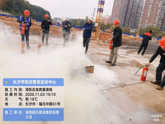 为了进一步强化消防安全管理,提高处理消防突发事件的能力,防患于未然。在长沙学院基建处副处长盛涛的带队下,长沙学院经管类专业实训中心项目代建单位、监理单位、施工单位于2020年11月3日上午10:00在长沙学院经管类专业实训中心项目现场进行消防基础知识学习及实战演习。
